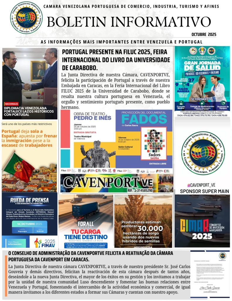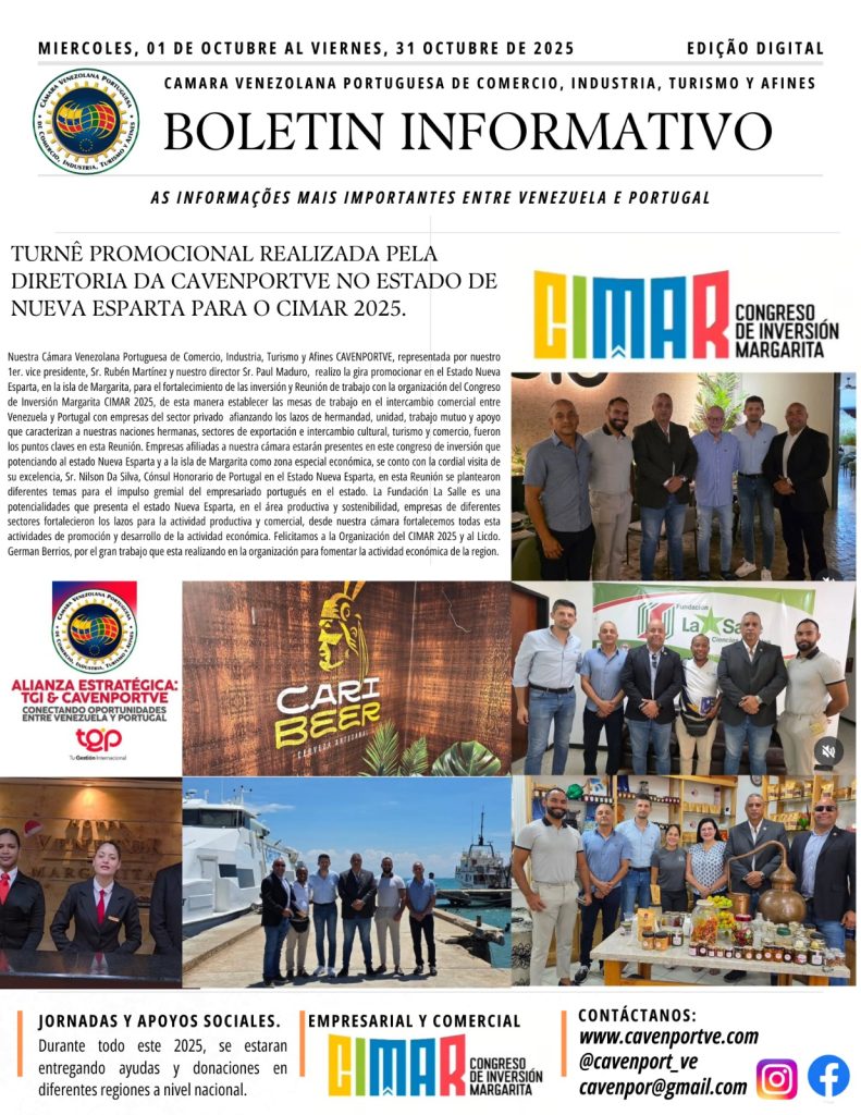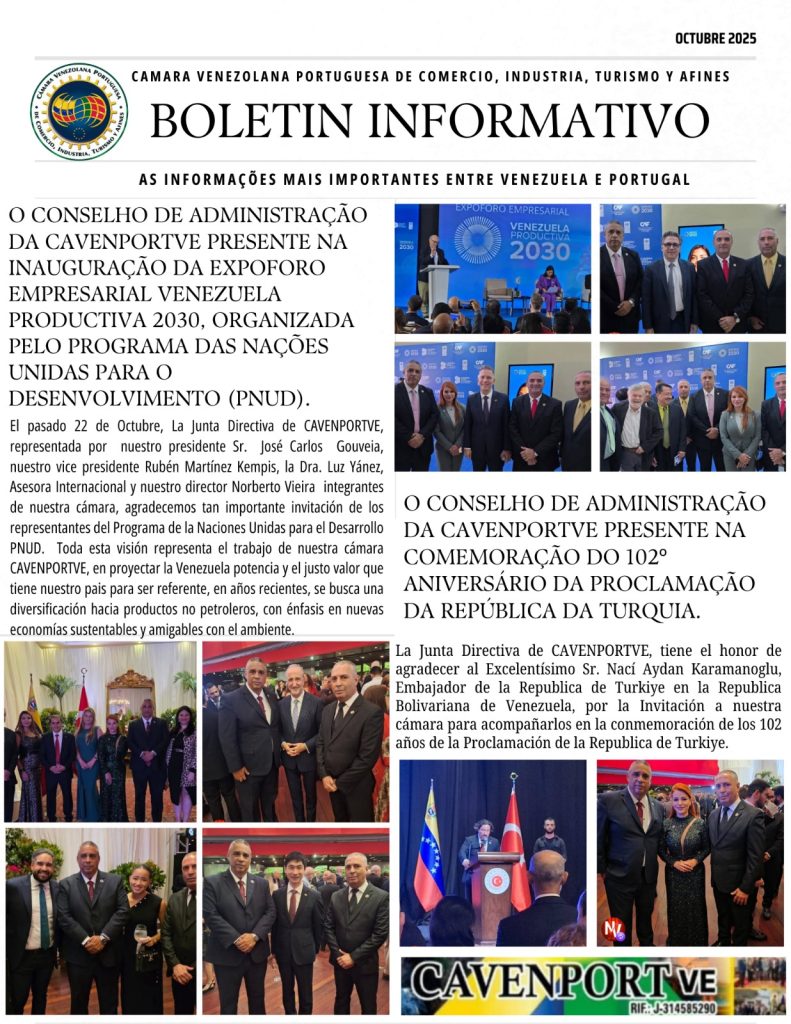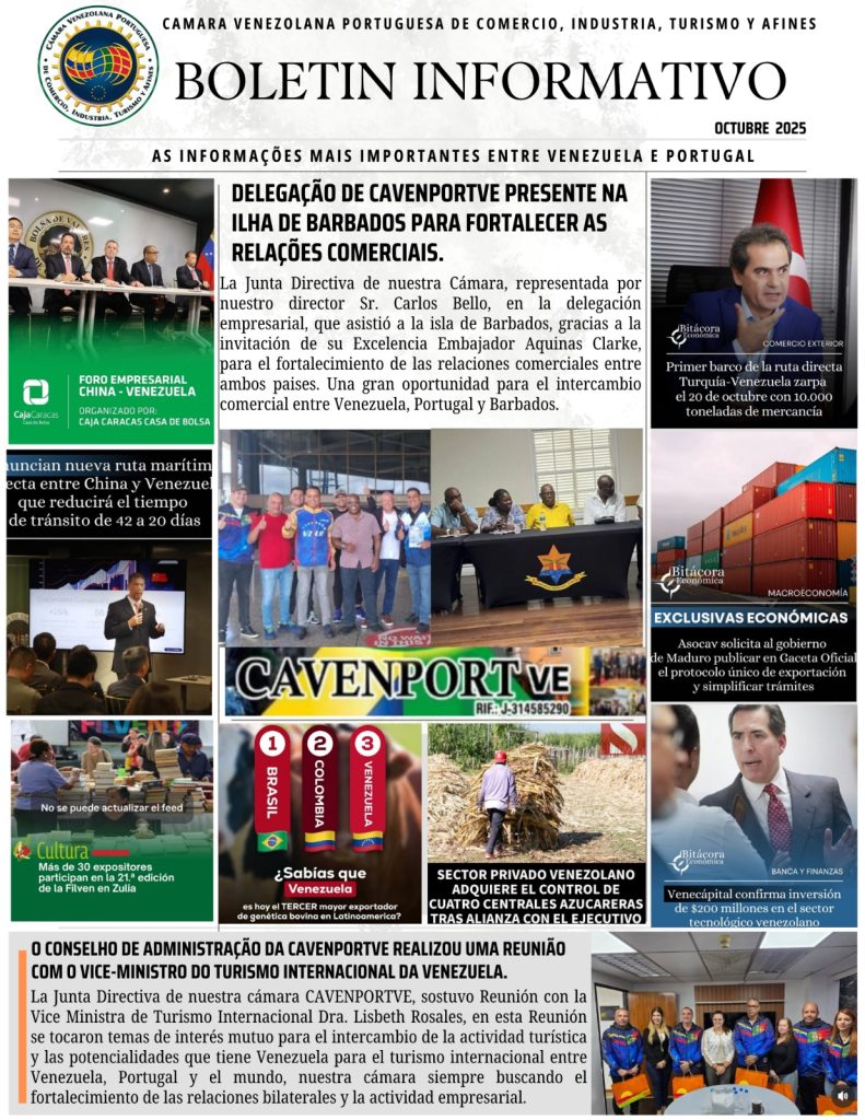 Compartimos con nuestros Afiliados, Colaboradores y Amigos el Boletín Informativo del mes de Octubre del 2025 de las importantes actividades gremiales que realizaron parte de la Junta Directiva de la Cámara Venezolana Portuguesa de Comercio, Industria, Turismo y Afines (CAVENPORTVE), @cavenport_ve encabezada por su presidente Sr. José Carlos Gouveia. Seguimos avanzando en fortalecer a la comunidad empresarial y a nuestros afiliados a nivel nacional e internacional.