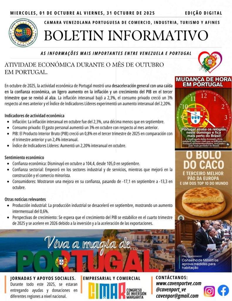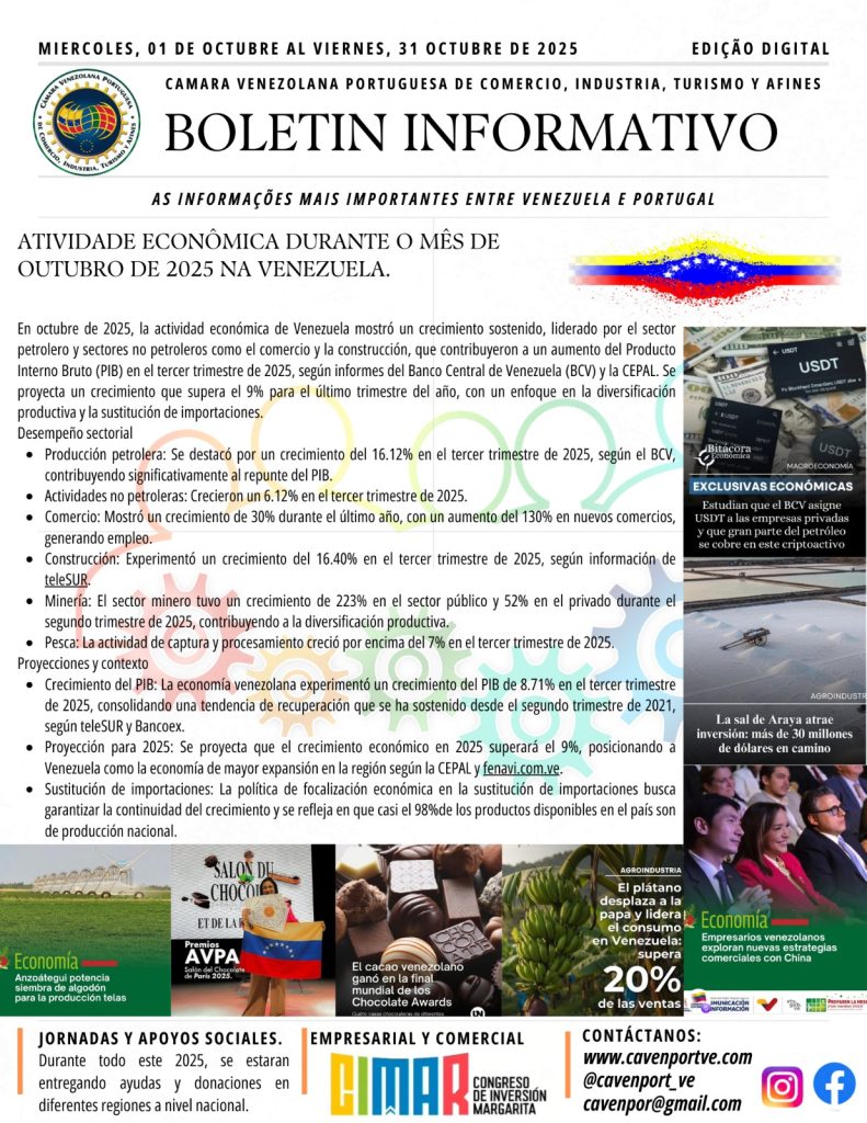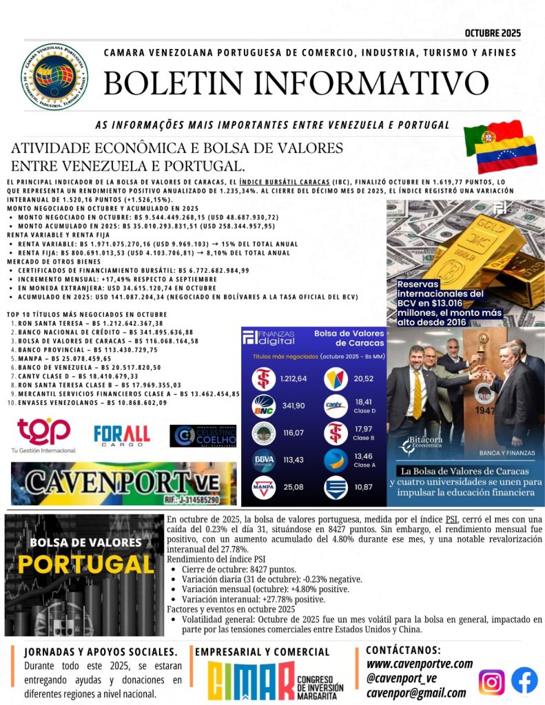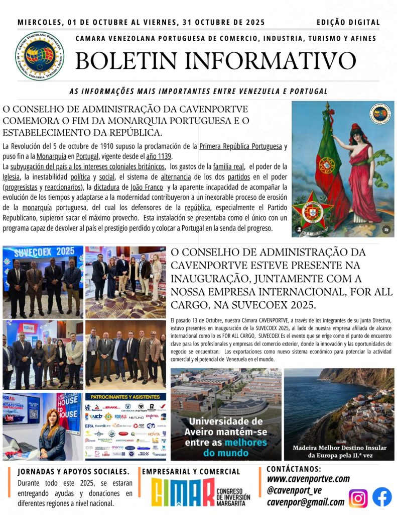 Compartimos con nuestros Afiliados, Colaboradores y Amigos el Boletín Informativo del mes de Octubre del 2025 de las importantes actividades gremiales que realizaron parte de la Junta Directiva de la Cámara Venezolana Portuguesa de Comercio, Industria, Turismo y Afines (CAVENPORTVE), @cavenport_ve encabezada por su presidente Sr. José Carlos Gouveia. Seguimos avanzando en fortalecer a la comunidad empresarial y a nuestros afiliados a nivel nacional e internacional.