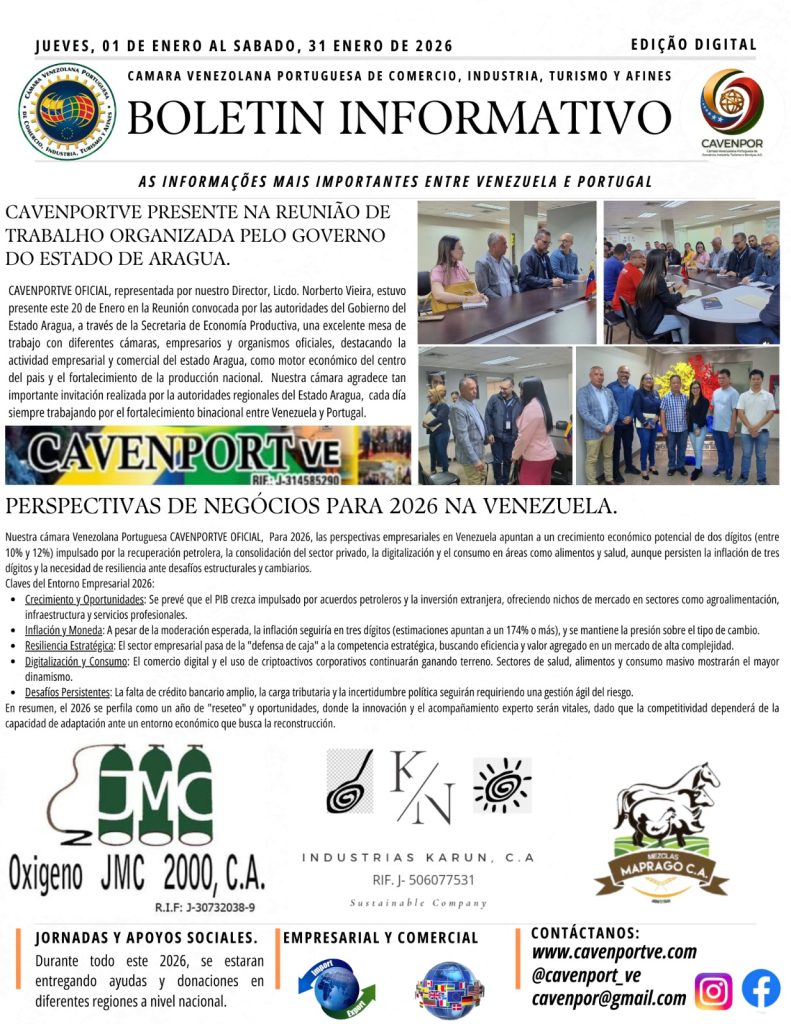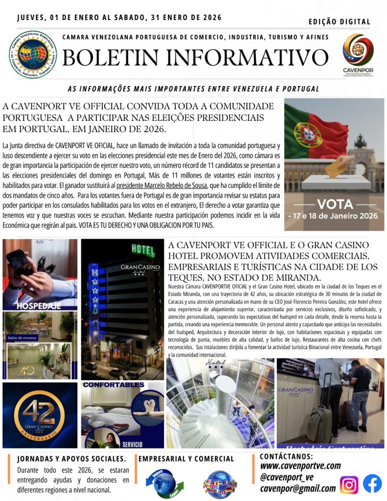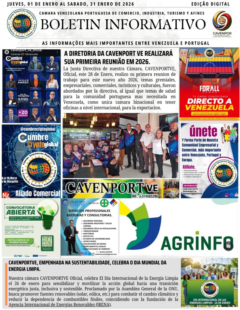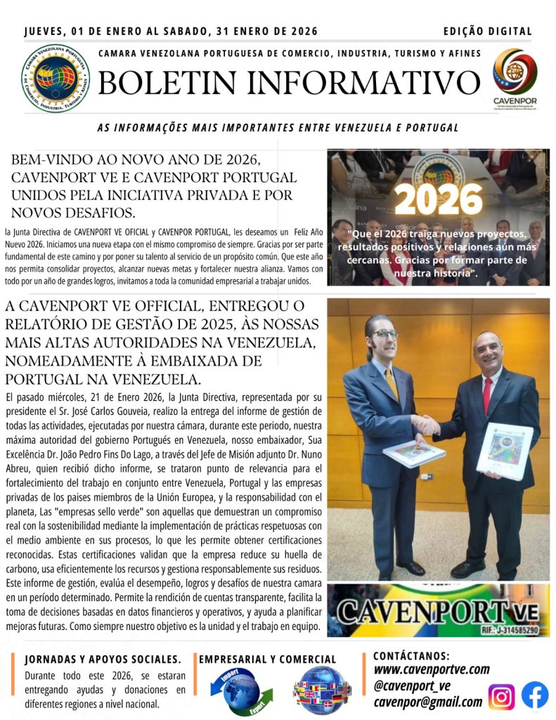 Desde a Direção da Câmara Venezuelana Portuguesa de Comércio, Indústria, Turismo e Afins (CAVENPORTVE), @cavenport_ve_oficial partilhamos o nosso Boletim Informativo do mês de Janeiro de 2026.