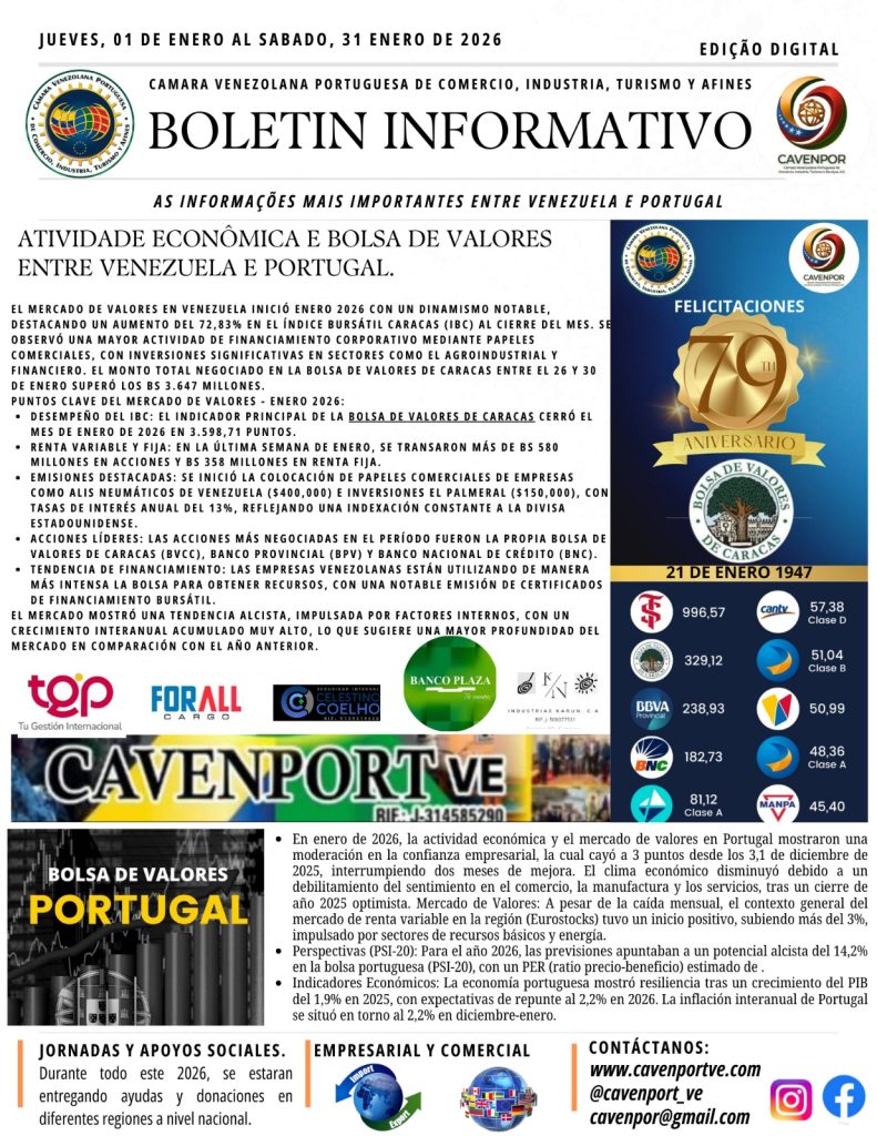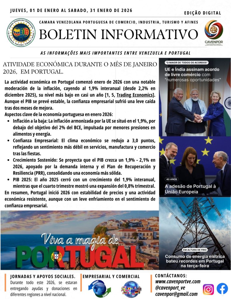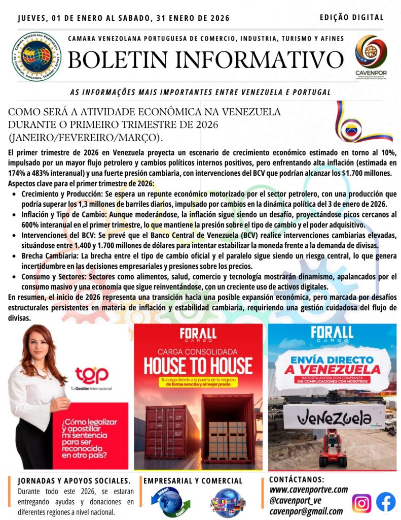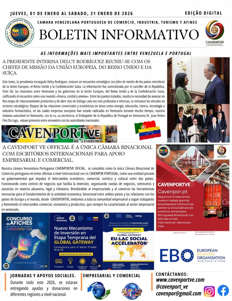 Desde a Direção da Câmara Venezuelana Portuguesa de Comércio, Indústria, Turismo e Afins (CAVENPORTVE), @cavenport_ve_oficial partilhamos o nosso Boletim Informativo do mês de Janeiro de 2026.